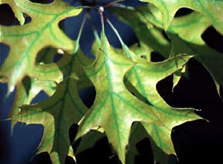 In eastern Nebraska, it is common to see slow growing pin oak or silver maple trees with yellow leaves and possibly some branch die back. Many trees, shrubs, and other ornamental plantings in Nebraska suffer from this problem, called iron chlorosis. It is caused by poorly drained or compacted soils or by soils with a high calcium content, characterized by pH levels above 7.5. This high pH level causes iron, which is usually present in plentiful quantities, to be tied up in the soil and unavailable for the plants to pick up and use.