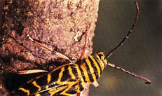 They will damage mostly Black locust trees. Mature larvae are 25 mm long and white with dark heads. Adult beetles are about 18 mm long and black with bright yellow bands across the thorax and wing covers. The third band on the wings forms a “w” design.