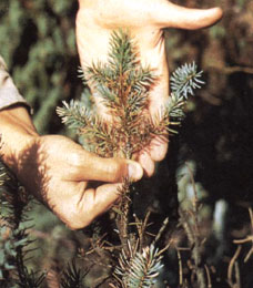 This fungus disease causes premature defoliation of spruce, Douglas fir, and pine. Chronic infections will devitalize trees, causing branch dieback, especially on the lower portions of the tree. Although treatments are available to suppress this disease, planting conifers in full sun with adequate spacing to allow development is the key to disease prevention.