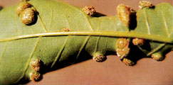 Information on the identity, life cycle, and control of most of these wasps is sketchy. Numerous species of cecidomyiid and cynipid wasps cause the formation of galls on the leaves, leafstalks, and stems of oaks. Oak-apple galls, which are found on midribs and petioles of leaves, are typical. They are caused by several species of very small wasps, the most common being A. confluenta.