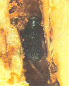 Several species of bark beetles breed in pines in the Great Plains. Larvae are usually “c” -shaped, legless, and white with brown heads. Adults range from 3 to 10 mm long and are brown or black.